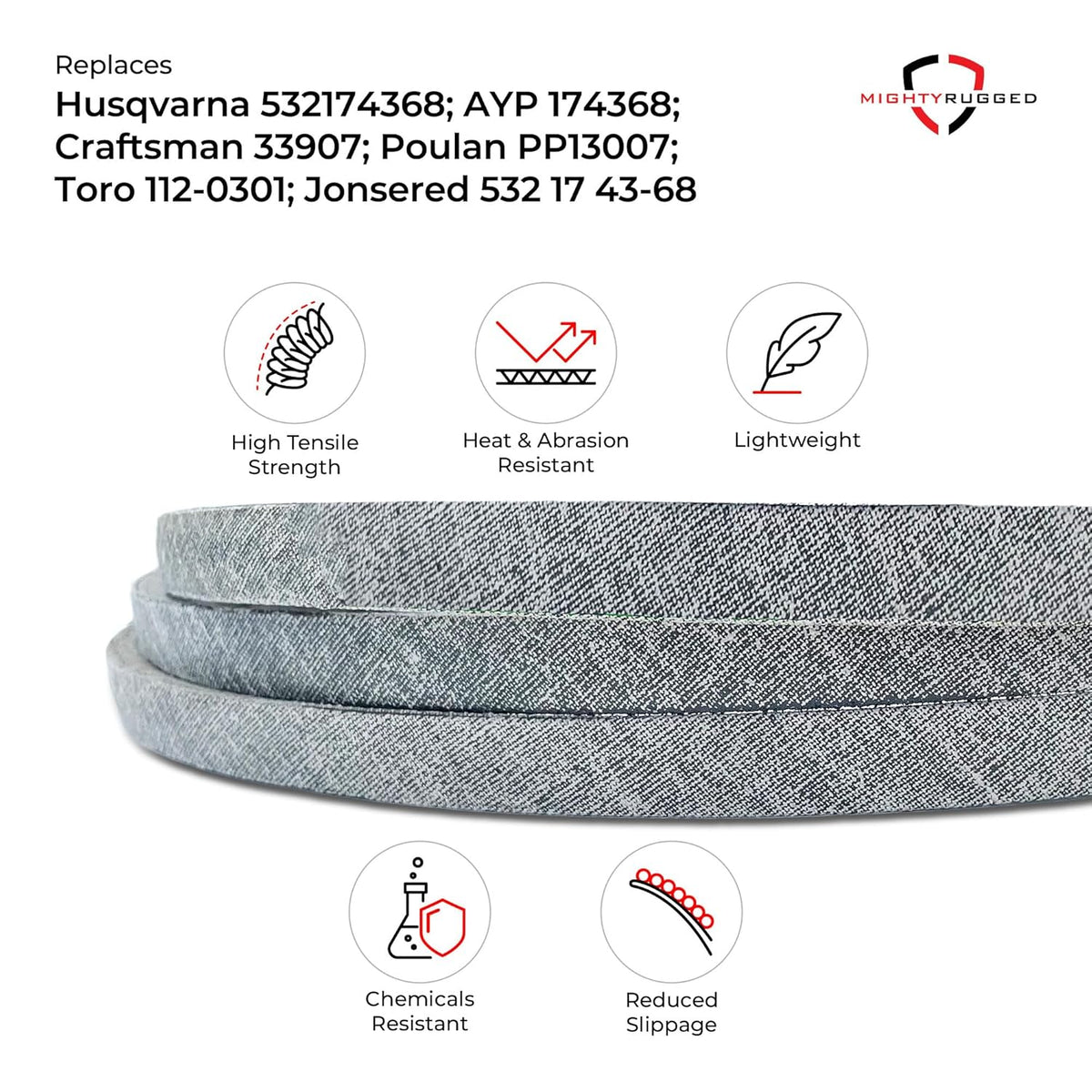 Premium Aramid/Kevlar cord deck belt replacement for 174368. Engineered to match OEM specifications at 40-60% less than dealer prices.