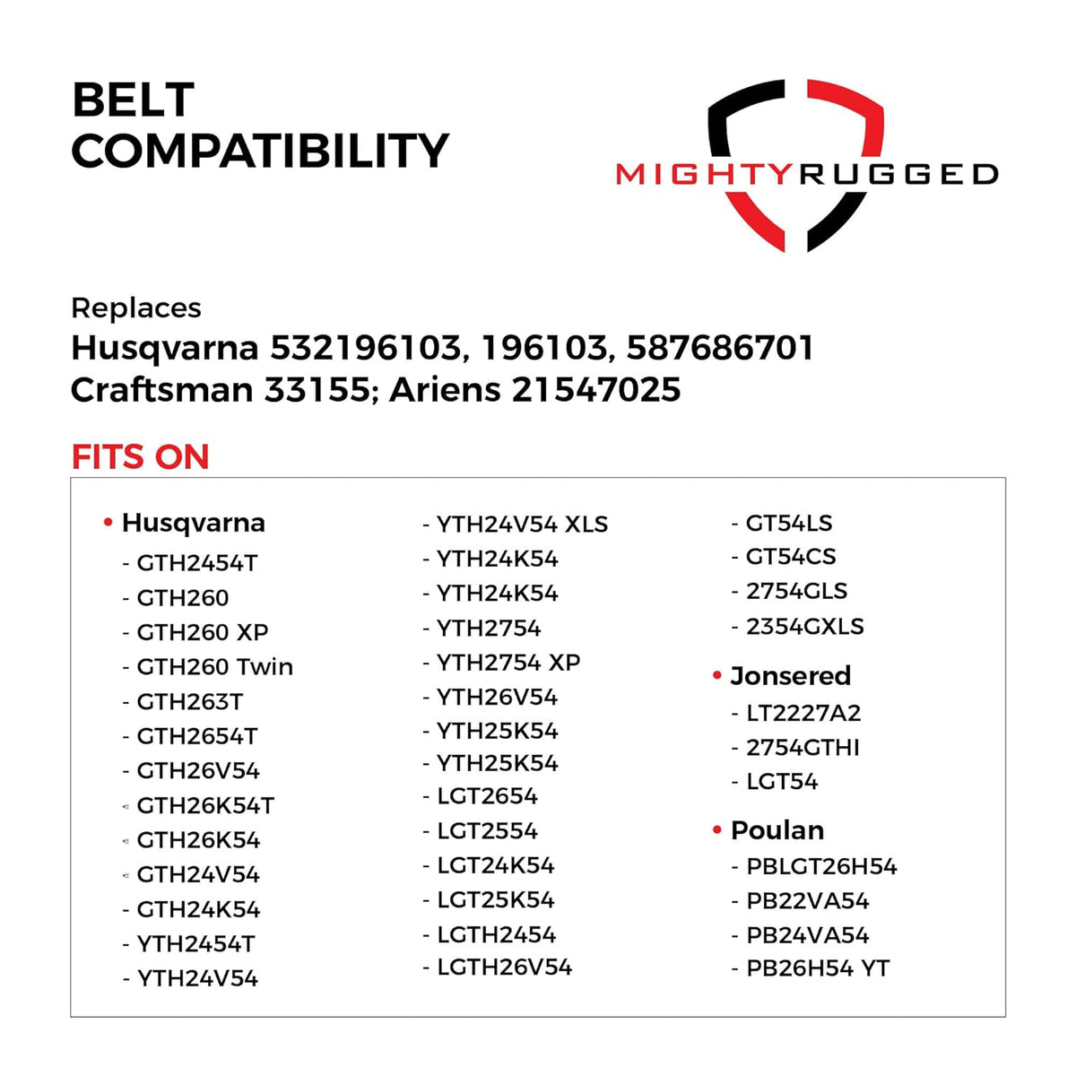 This belt fits the following mower brands: Husqvarna, Craftsman, Ariens, AYP, Oregon, Stens, Jonsered, Sears